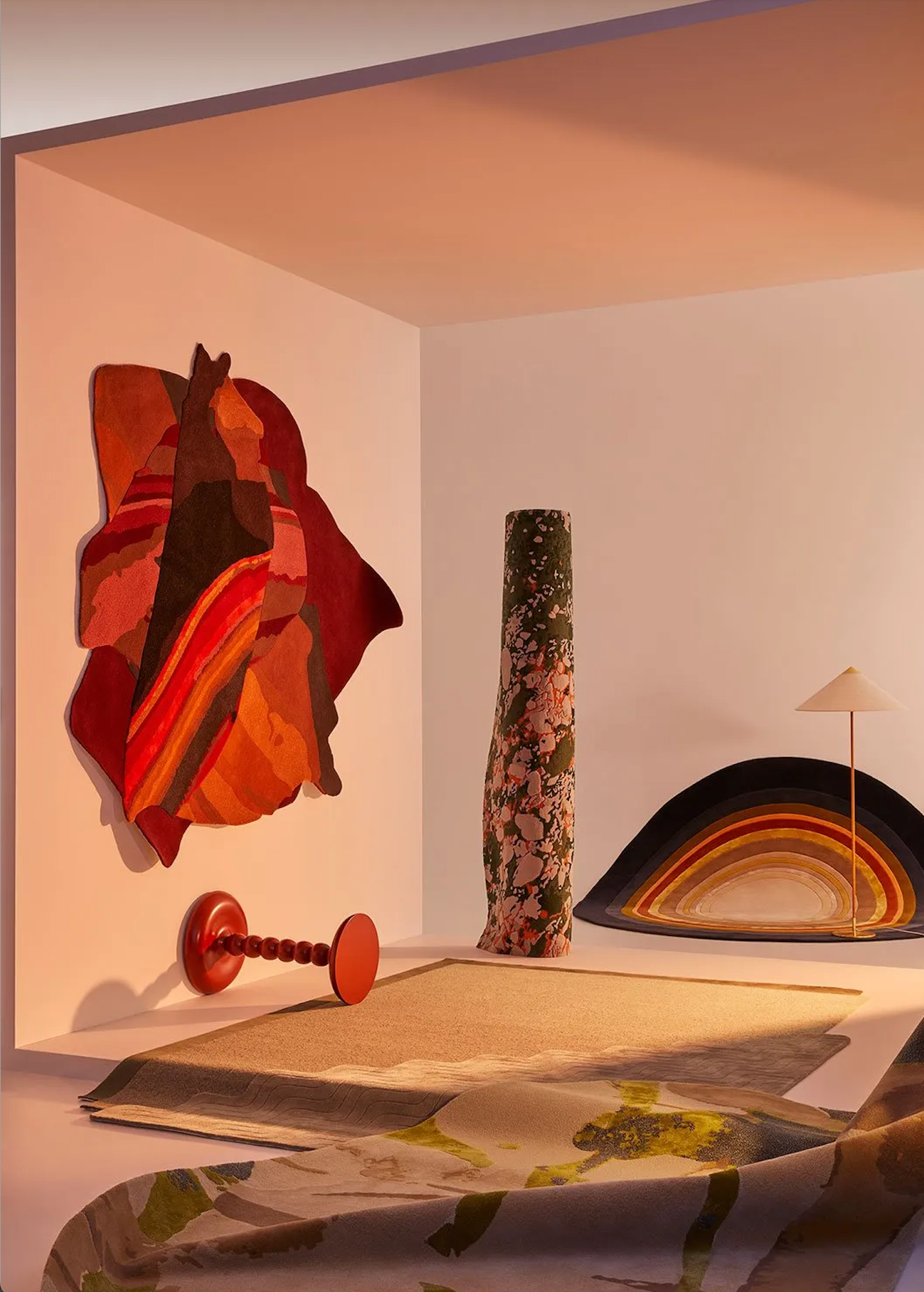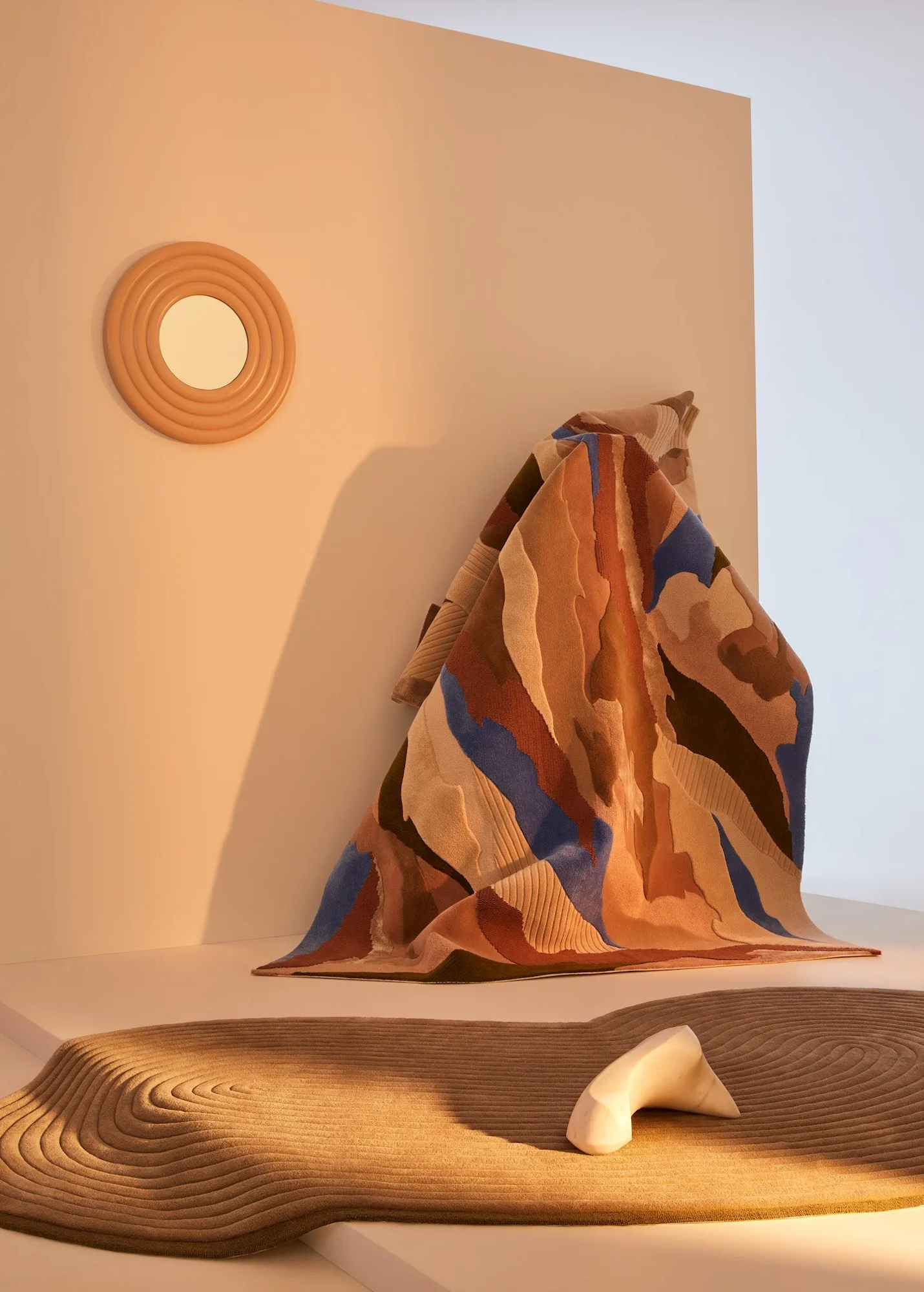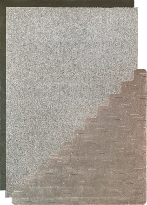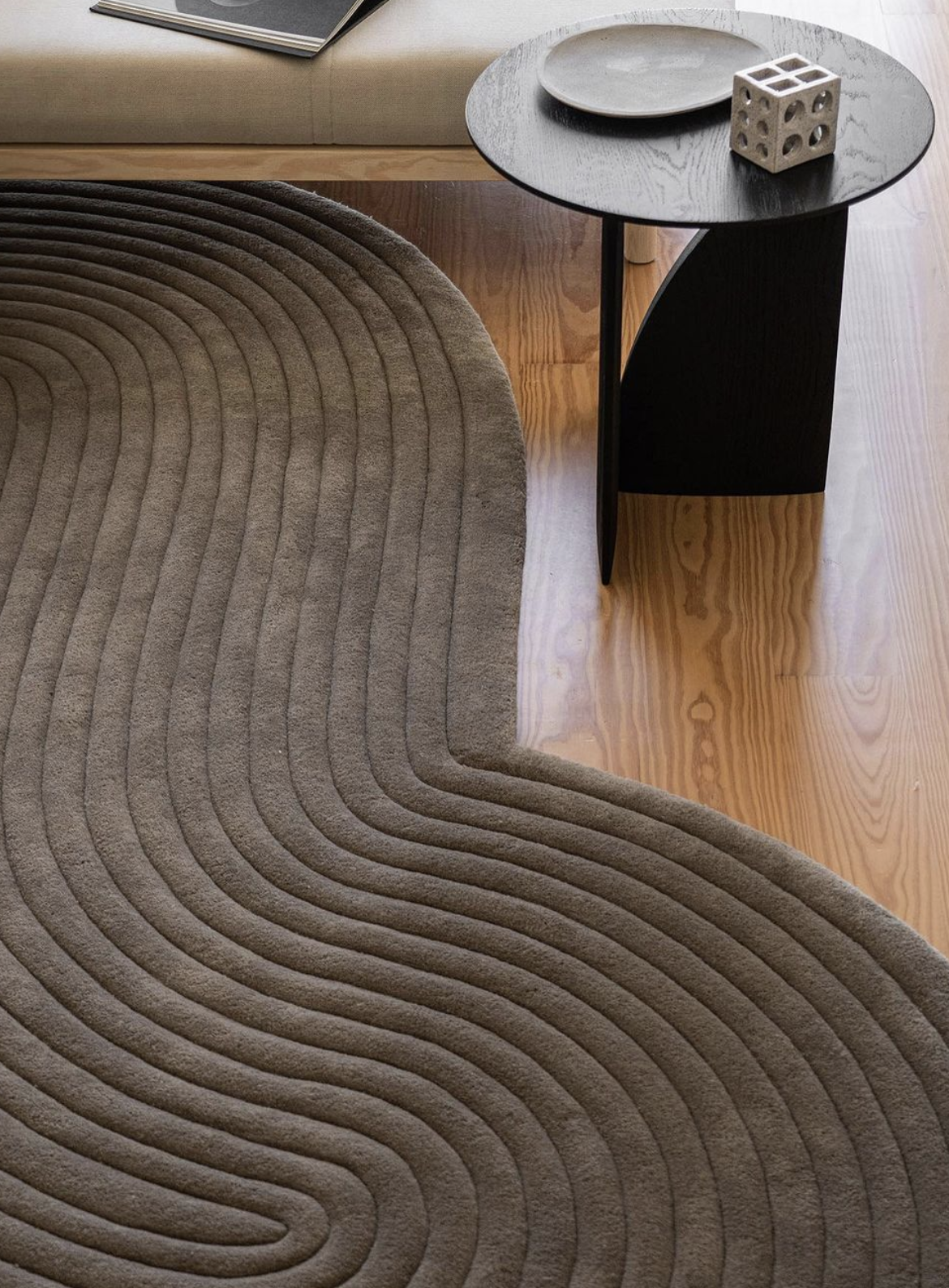Rotational movement translated into textile pattern. The design builds from a simple linear structure that expands and twists across the surface to create a sense of motion and depth. The result is a rug that feels both graphic and spatial.