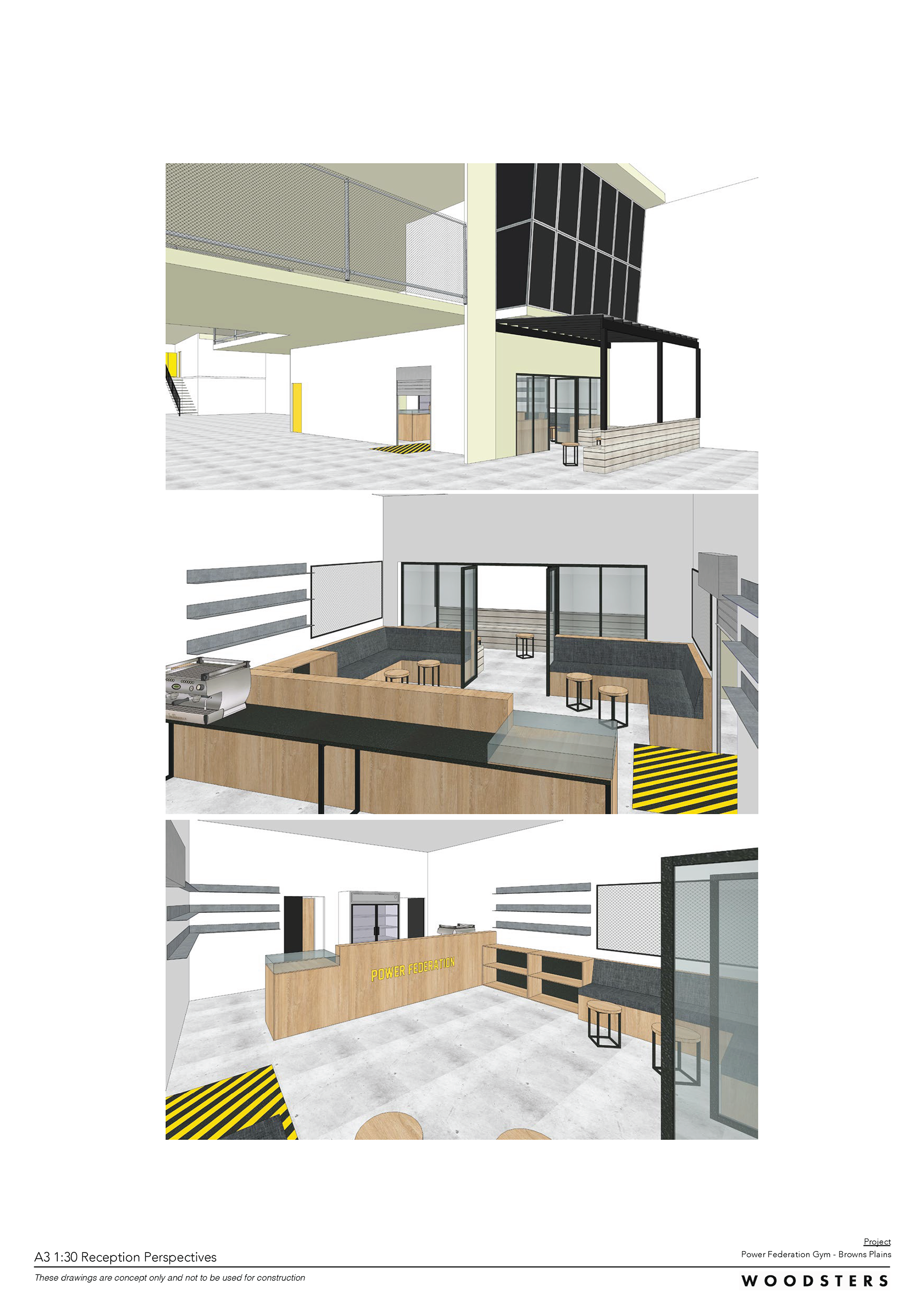 Commercial fitout concept for a large-format gym in Browns Plains, Queensland. The design covers reception, consultation lounges, point of sale, bathrooms, staff facilities, and a mezzanine level. Documentation includes dimensioned plans, bathroom layouts, and perspectives across all key areas of the space.