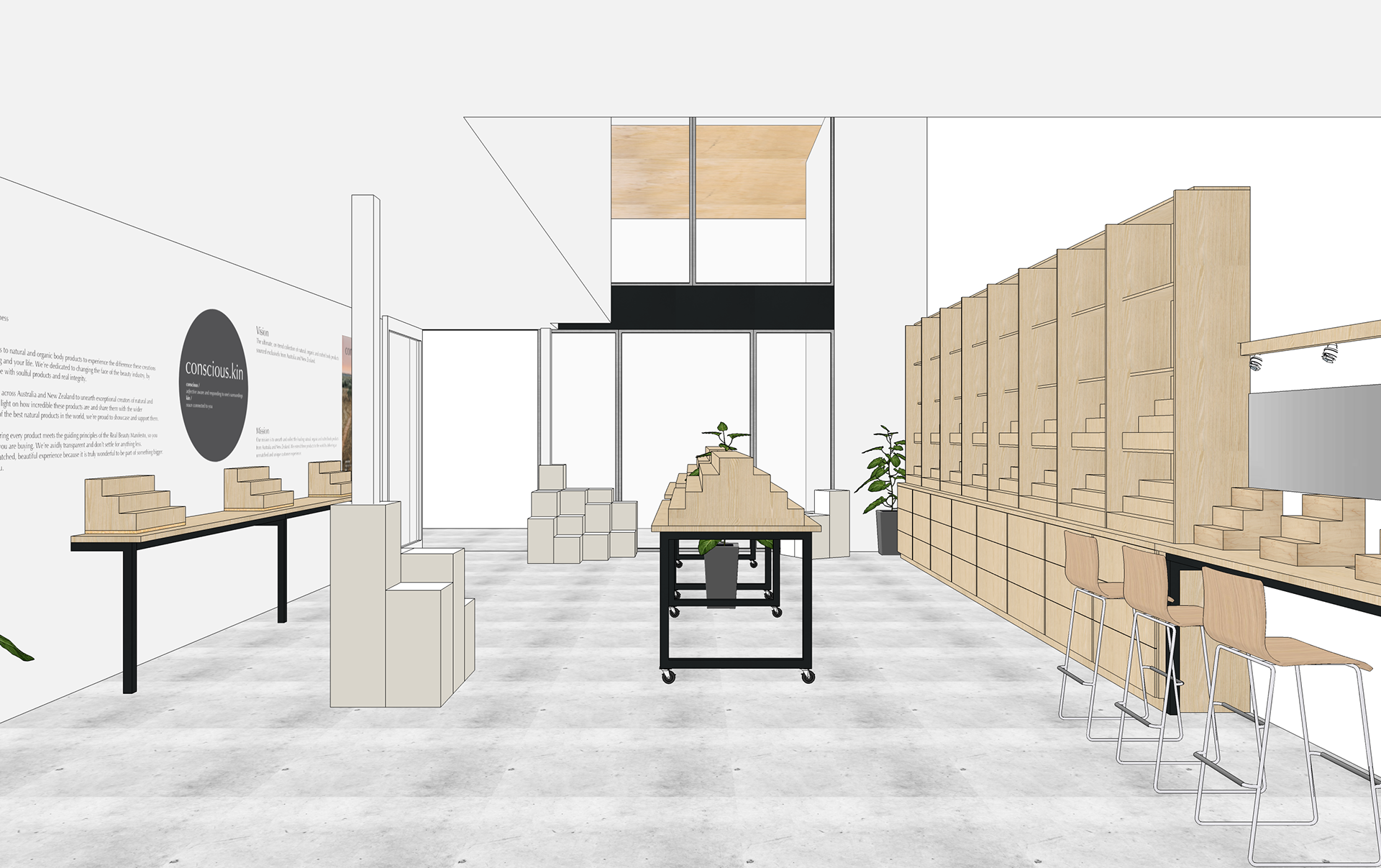 Retail environment developed for Conscious Kin, designed to highlight natural materials and a calm, tactile atmosphere. The project focused on spatial flow, display systems, and material cohesion to create an intimate customer experience.